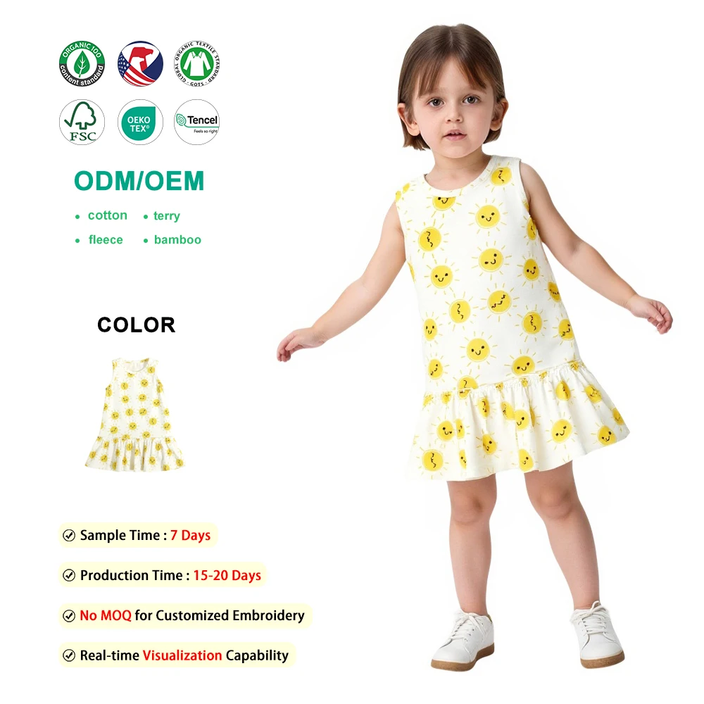 Skin-Friendly 95% Cotton Toddler Girls Sun Print Sleeveless Ruffled Hem Dress for Daily & Summer Wear